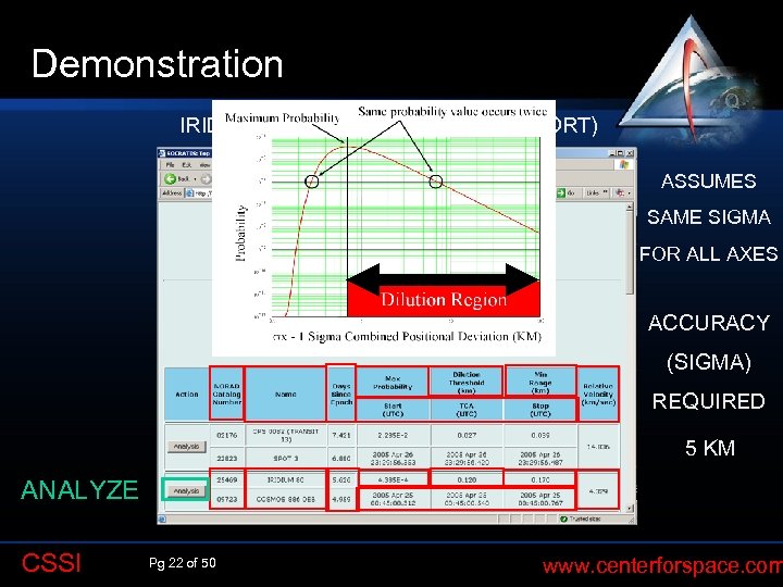 Demonstration Q IRIDIUM VS. COSMOS (APR 20 REPORT) ASSUMES SAME SIGMA FOR ALL AXES ACCURACY (SIGMA) REQUIRED 5 KM ANALYZE CSSI Pg 22 of 50 www. centerforspace. com