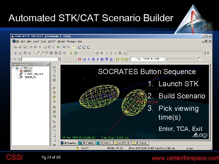 Automated STK/CAT Scenario Builder Q SOCRATES Button Sequence 1. Launch STK 2. Build Scenario 3. Pick viewing time(s) Enter, TCA, Exit CSSI Pg 24 of 50 www. centerforspace. com