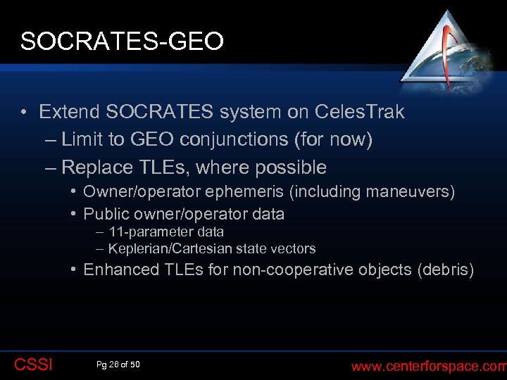 SOCRATES-GEO • Extend SOCRATES system on Celes. Trak – Limit to GEO conjunctions (for now) – Replace TLEs, where possible • Owner/operator ephemeris (including maneuvers) • Public owner/operator data – 11 -parameter data – Keplerian/Cartesian state vectors • Enhanced TLEs for non-cooperative objects (debris) CSSI Pg 26 of 50 www. centerforspace. com