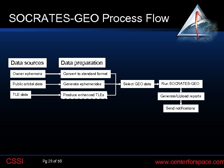 SOCRATES-GEO Process Flow Data sources Data preparation Owner ephemeris Convert to standard format Public orbital data Generate ephemerides TLE data Produce enhanced TLEs Select GEO data Run SOCRATES-GEO Generate/Upload reports Send notifications CSSI Pg 28 of 50 www. centerforspace. com