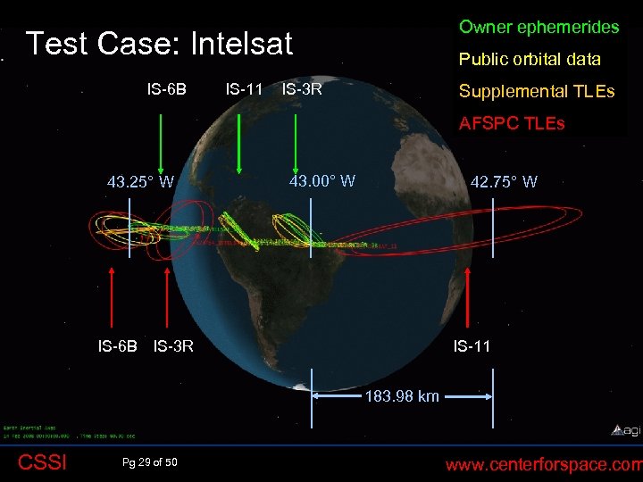 Owner ephemerides Test Case: Intelsat IS-6 B IS-11 Public orbital data IS-3 R Supplemental TLEs AFSPC TLEs 43. 25° W 43. 00° W 42. 75° W IS-6 B IS-3 R IS-11 183. 98 km CSSI Pg 29 of 50 www. centerforspace. com