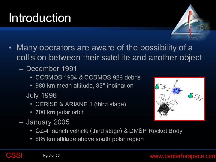 Introduction Q • Many operators are aware of the possibility of a collision between their satellite and another object – December 1991 • COSMOS 1934 & COSMOS 926 debris • 980 km mean altitude, 83° inclination – July 1996 • CERISE & ARIANE 1 (third stage) • 700 km polar orbit – January 2005 • CZ-4 launch vehicle (third stage) & DMSP Rocket Body • 885 km altitude above south polar region CSSI Pg 3 of 50 www. centerforspace. com