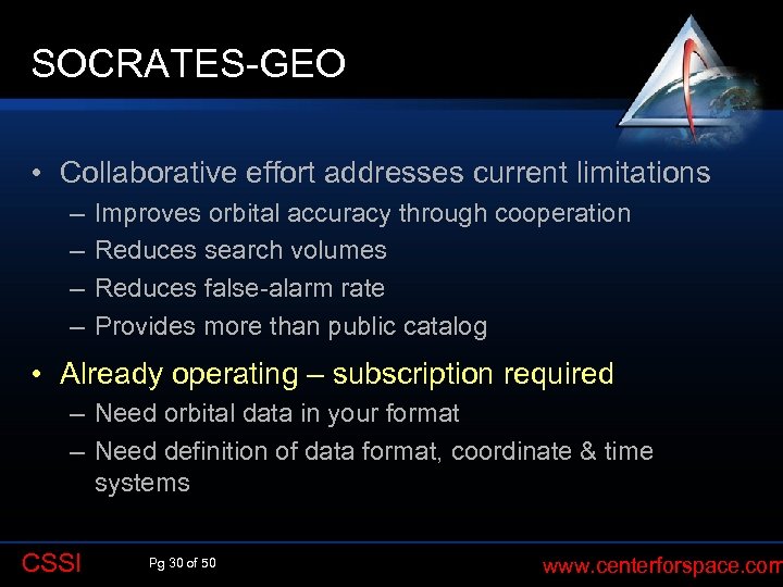 SOCRATES-GEO • Collaborative effort addresses current limitations – – Improves orbital accuracy through cooperation Reduces search volumes Reduces false-alarm rate Provides more than public catalog • Already operating – subscription required – Need orbital data in your format – Need definition of data format, coordinate & time systems CSSI Pg 30 of 50 www. centerforspace. com
