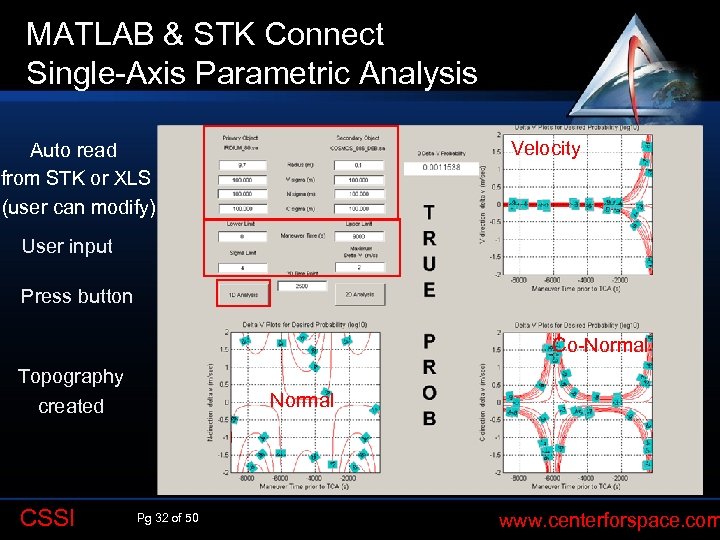 MATLAB & STK Connect Single-Axis Parametric Analysis Velocity Auto read from STK or XLS (user can modify) User input Press button Co-Normal Topography created CSSI Normal Pg 32 of 50 www. centerforspace. com