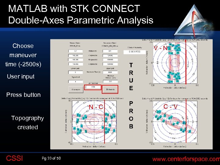 MATLAB with STK CONNECT Double-Axes Parametric Analysis Choose maneuver time (-2500 s) V-N User input Press button N-C C-V Topography created CSSI Pg 33 of 50 www. centerforspace. com