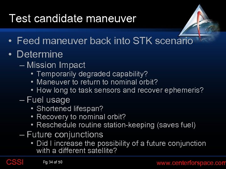 Test candidate maneuver • Feed maneuver back into STK scenario • Determine – Mission Impact • Temporarily degraded capability? • Maneuver to return to nominal orbit? • How long to task sensors and recover ephemeris? – Fuel usage • Shortened lifespan? • Recovery to nominal orbit? • Reschedule routine station-keeping (saves fuel) – Future conjunctions • Did I increase the possibility of a future conjunction with a different satellite? CSSI Pg 34 of 50 www. centerforspace. com