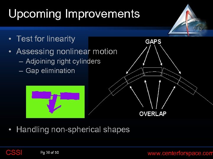 Upcoming Improvements Q • Test for linearity • Assessing nonlinear motion – Adjoining right cylinders – Gap elimination • Handling non-spherical shapes CSSI Pg 36 of 50 www. centerforspace. com