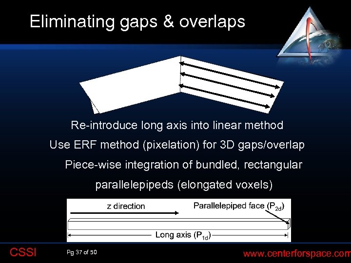 Eliminating gaps & overlaps Q Re-introduce long axis into linear method Use ERF method (pixelation) for 3 D gaps/overlap Piece-wise integration of bundled, rectangular parallelepipeds (elongated voxels) CSSI Pg 37 of 50 www. centerforspace. com