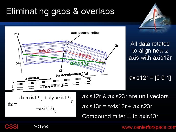 Eliminating gaps & overlaps Q axis 13 r All data rotated to align new z axis with axis 12 r = [0 0 1] axis 12 r & axis 23 r are unit vectors axis 13 r = axis 12 r + axis 23 r Compound miter ┴ to axis 13 r CSSI Pg 38 of 50 www. centerforspace. com