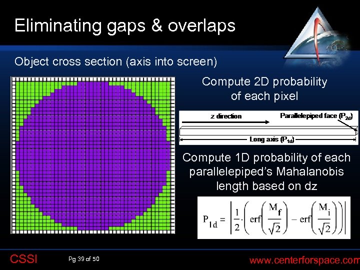 Eliminating gaps & overlaps Q Object cross section (axis into screen) Compute 2 D probability of each pixel Compute 1 D probability of each parallelepiped’s Mahalanobis length based on dz CSSI Pg 39 of 50 www. centerforspace. com
