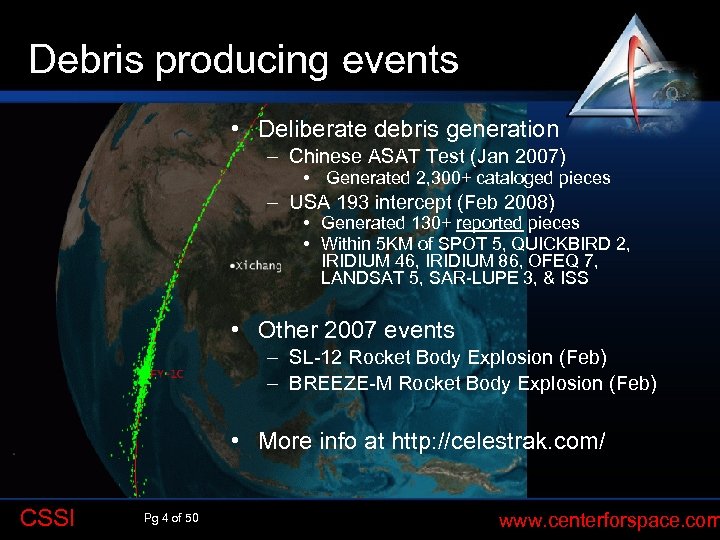 Debris producing events Q • Deliberate debris generation – Chinese ASAT Test (Jan 2007) • Generated 2, 300+ cataloged pieces – USA 193 intercept (Feb 2008) • Generated 130+ reported pieces • Within 5 KM of SPOT 5, QUICKBIRD 2, IRIDIUM 46, IRIDIUM 86, OFEQ 7, LANDSAT 5, SAR-LUPE 3, & ISS • Other 2007 events – SL-12 Rocket Body Explosion (Feb) – BREEZE-M Rocket Body Explosion (Feb) • More info at http: //celestrak. com/ CSSI Pg 4 of 50 www. centerforspace. com