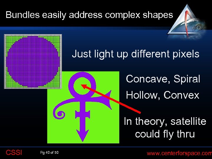 Bundles easily address complex shapes Q Just light up different pixels Concave, Spiral Hollow, Convex In theory, satellite could fly thru CSSI Pg 40 of 50 www. centerforspace. com