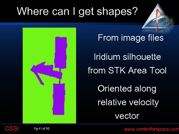 Where can I get shapes? Q From image files Iridium silhouette from STK Area Tool Oriented along relative velocity vector CSSI Pg 41 of 50 www. centerforspace. com