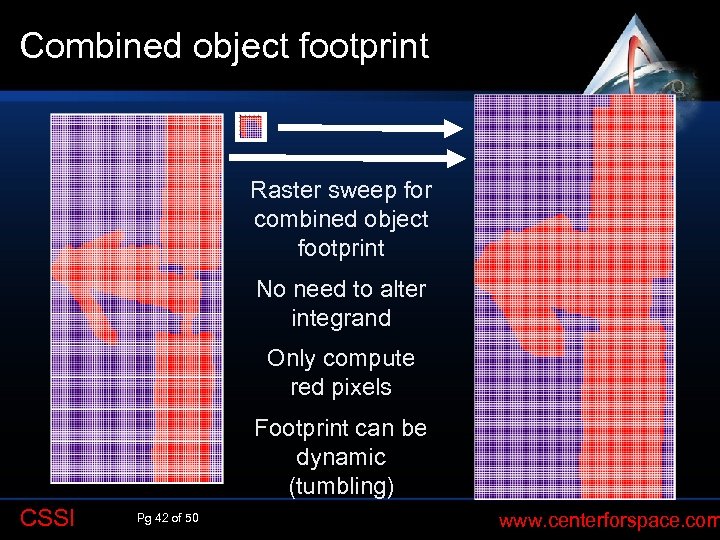 Combined object footprint Q Raster sweep for combined object footprint No need to alter integrand Only compute red pixels Footprint can be dynamic (tumbling) CSSI Pg 42 of 50 www. centerforspace. com
