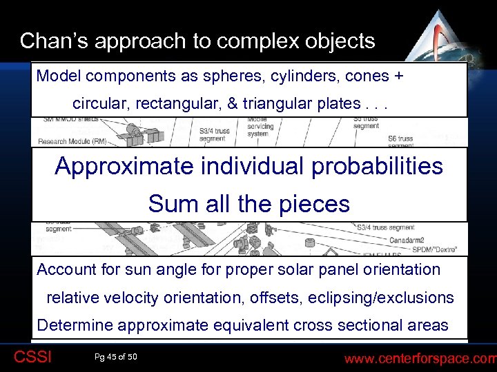 Chan’s approach to complex objects Q Model components as spheres, cylinders, cones + circular, rectangular, & triangular plates. . . Approximate individual probabilities Sum all the pieces Account for sun angle for proper solar panel orientation relative velocity orientation, offsets, eclipsing/exclusions Determine approximate equivalent cross sectional areas CSSI Pg 45 of 50 www. centerforspace. com