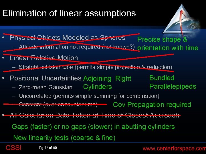 Elimination of linear assumptions Q • Physical Objects Modeled as Spheres Precise shape & – Attitude information not required (not known? ) orientation with time • Linear Relative Motion – Straight collision tube (permits simple projection & reduction) • Positional Uncertainties Adjoining Right Cylinders – Zero-mean Gaussian Bundled Parallelepipeds – Uncorrelated (permits simple summing for combination) – Constant (over encounter time) Cov Propagation required • All Calculation Data Taken at Time of Closest Approach Gaps (faster) or no gaps (slower) in abutting cylinders New linearity tests (coarse & fine) Pg 47 of 50 CSSI www. centerforspace. com