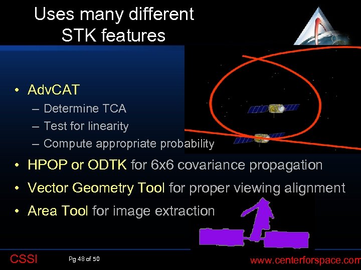 Uses many different STK features Q • Adv. CAT – Determine TCA – Test for linearity – Compute appropriate probability • HPOP or ODTK for 6 x 6 covariance propagation • Vector Geometry Tool for proper viewing alignment • Area Tool for image extraction CSSI Pg 48 of 50 www. centerforspace. com