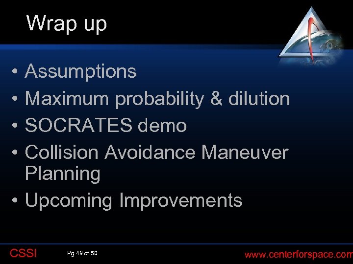 Wrap up Q • • Assumptions Maximum probability & dilution SOCRATES demo Collision Avoidance Maneuver Planning • Upcoming Improvements CSSI Pg 49 of 50 www. centerforspace. com