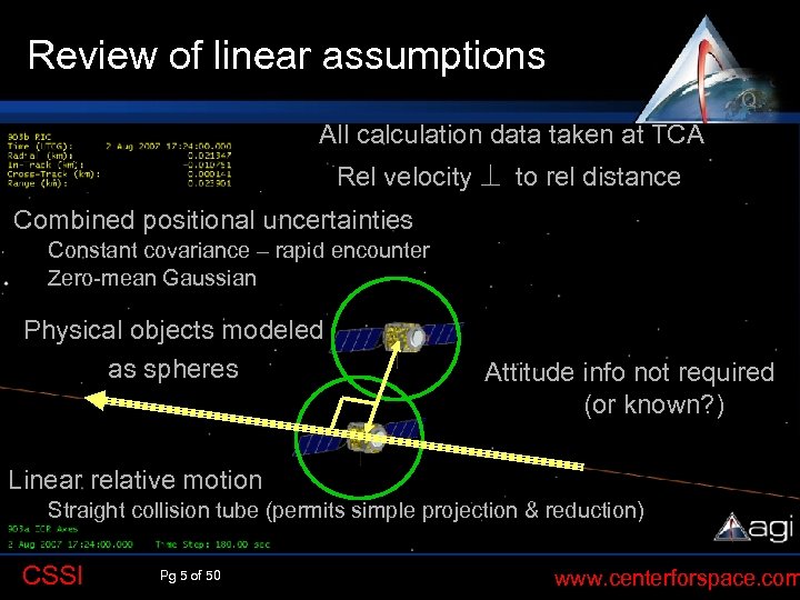 Review of linear assumptions Q All calculation data taken at TCA Rel velocity ^ to rel distance Combined positional uncertainties Constant covariance – rapid encounter Zero-mean Gaussian Physical objects modeled as spheres Attitude info not required (or known? ) Linear relative motion Straight collision tube (permits simple projection & reduction) CSSI Pg 5 of 50 www. centerforspace. com