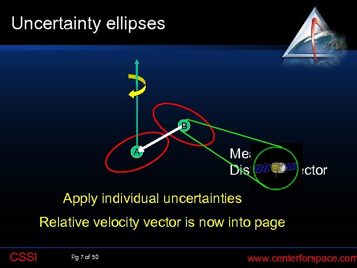 Uncertainty ellipses Q B A Mean Miss Distance Vector Apply individual uncertainties Relative velocity vector is now into page CSSI Pg 7 of 50 www. centerforspace. com