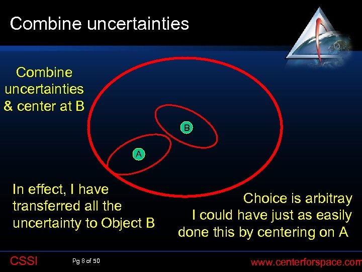 Combine uncertainties Q Combine uncertainties & center at B B A In effect, I have transferred all the uncertainty to Object B CSSI Pg 8 of 50 Choice is arbitray I could have just as easily done this by centering on A www. centerforspace. com