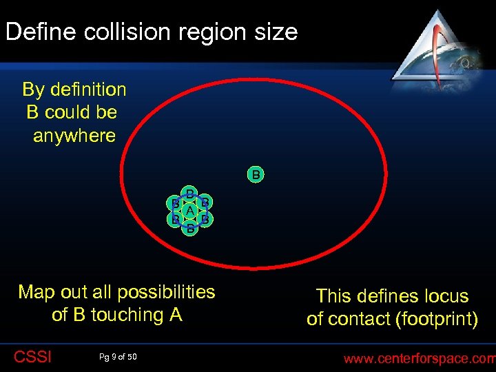 Define collision region size Q By definition B could be anywhere B B A B B B Map out all possibilities of B touching A CSSI Pg 9 of 50 This defines locus of contact (footprint) www. centerforspace. com