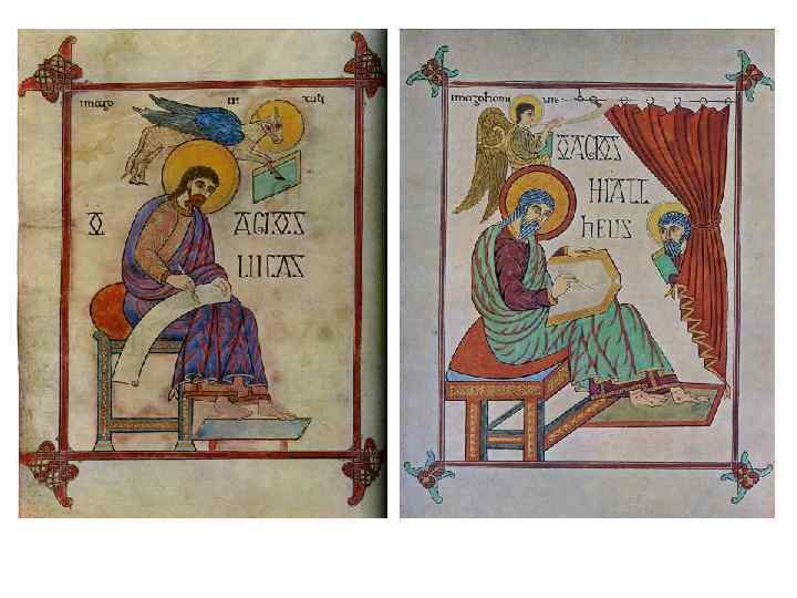 The St Augustine Gospels (Евангелие Августина Кентерберийского, или Евангелие из колледжа Тела Христова) • • VI в. Cambridge, Corpus Christi College, Lib. MS. 286 Рим или Монте Кассино, откуда привезен в Англии вскоре после своего создания, в аббатстве Св. Августина в Кентербери. Возможно привезен Августином Кентерберийским в 597 г. Древнейший список иллюминованного латинского Евангелия, сохранились 2 миниатюры