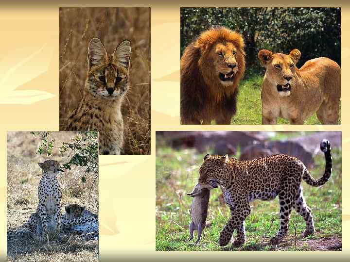 ЖИВОТНЫЕ n - § Адаптации к засушливому периоду: анабиоз (насекомые, амфибии, рептилии); миграции и кочевки большого масштаба (птицы и млекопитающие). Отсутствие узкоспециализированных древесных видов; § Большое количество травоядных животных; § Утилизация отмершей растительности за счет деятельности термитов.