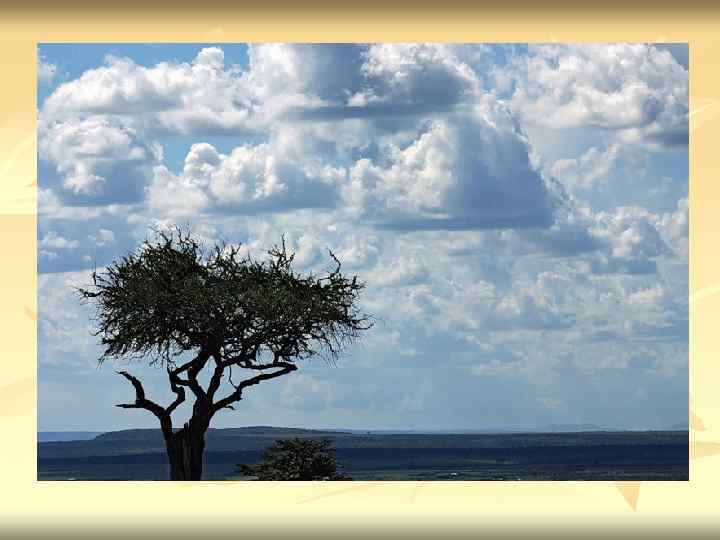 Типы саванн n n n Затопляемые – расположены по берегам рек, в поймах. Влажные – 800 -2000 мм осадков/год, сухой период 3 -5 мес. Термитные - носят парковый характер. Сухие – 500 -1200 мм осадков/год, сухой период 5 -7 мес. Колючие – 250 -750 мм осадков/год, сухой период 8 -10 мес.