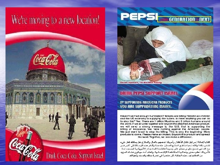 Produk Makanan & Minuman AS - Mirinda , 7 up, Sprite dan Fanta - Coca-Cola dan anak perusahannya (Anda kalau membaca tulisan Cola-cola dari belakang botol, akan tertulis: no Muhammad, no Mecca) - Produk Hanes and Crystal: Mayonnaise, Kecap - California Garden and Warner & Lambert