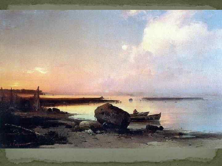 Факты биографии Летом 1854 года Саврасов работает у Финского залива под Петербургом, а на осенней выставке в Академии художеств показывает две картины, «Вид в окрестностях Ораниенбаума» и «Морской берег в окрестностях Ораниенбаума» , за которые ему было присвоено звание академика. Ранние произведения проникнуты склонностью к возвышенному восприятию природы, стилем романтизма.
