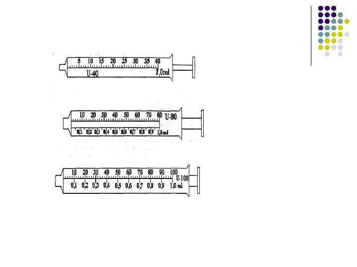 l l l l Для поддержания нормального уровня сахара в крови применяют инсулин. Доза инсулина подбирается индивидуально для каждого больного, исходя из веса, роста, вида деятельности и т. д. (дозу подбирает врач). Шприцы для введения инсулина бывают так же для 40 ЕД и 100 ЕД в 1 мл. При введении инсулина шприцы должны строго соответствовать концентрации инсулина. Для введения инсулина на 40 ЕД брать шприц на 40 ЕД, Для введения инсулина на 100 ЕД брать шприц на 100 ЕД. Категорически не допускается проводить инъекцию инсулина не инсулиновым шприцом