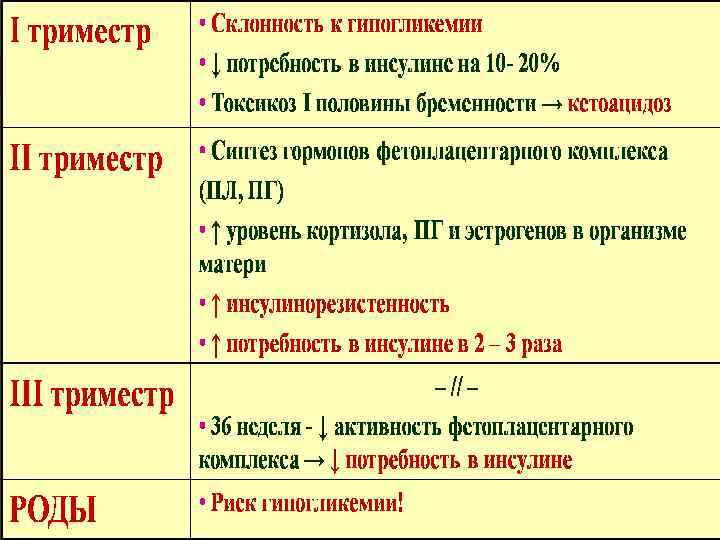 Срок беременности Проводимые мероприятия До 20 недель • Нормализация метаболических нарушений • Решение вопроса о возможности сохранения беременности Сроки 20 -24 недели госпитализации 32 -34 недели • Коррекция дозы инсулина • Лечение осложнений беременности • Получение информации о размерах и состоянии плода • Определение способа родоразрешения и ориентировочных сроков