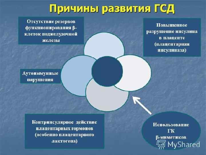 Факторы риска по развитию ГСД: Избыточная масса тела (>20% от идеальной МТ) Наличие СД 2 типа у родственников Нарушение толерантности к глюкозе Глюкозурия во время предшествующей или данной беременности Крупный плод и/или многоводие в анамнезе Быстрая прибавка в весе во время беременности Мертворождение в анамнезе Рождение ребенка весом более 4000 гр в анамнезе Возраст женщины старше 30 лет