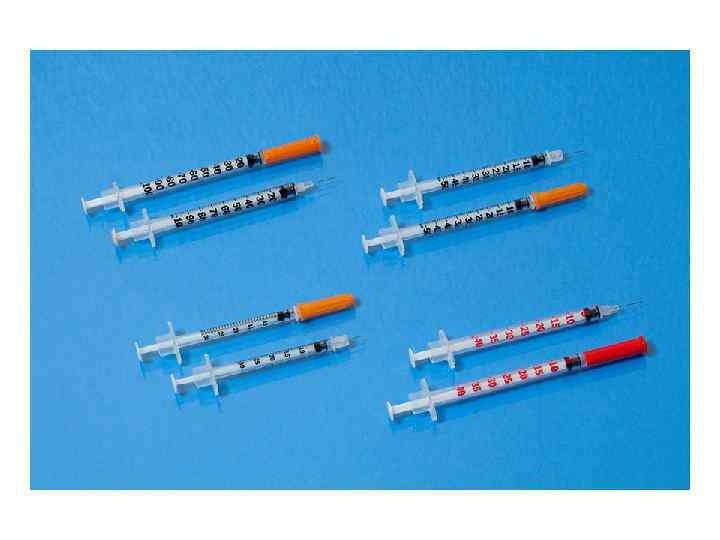 Виды инсулина • Простой (действует 6 -8 часов) • Средней продолжительности (12 -20 часов) • Пролонгированный (24 часа и более) • Концентрация инсулина во флаконе составляет 100 ЕД/мл (выпуск инсулина с концентрацией 40 ЕД/мл прекращён)
