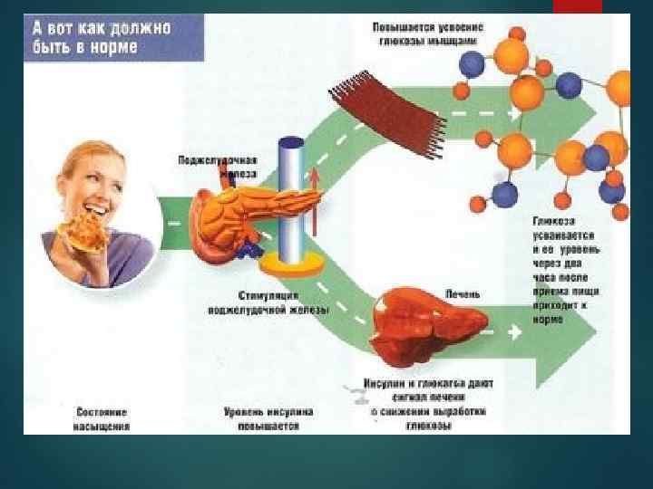Внепанкреатическая недостаточность (2 -й тип диабета) Для диабета 2 -го типа (устаревшее название — инсулинонезависимый диабет) характерны нарушения, указанные в пункте 2 (см. выше). При этом типе диабета инсулин производится в нормальных или даже в повышенных количествах, однако нарушается механизм взаимодействия инсулина с клетками организма (инсулинорезистентность). Главной причиной инсулинрезистентности является нарушение функций мембранных рецепторов инсулина при ожирении (основной фактор риска, 80% больных диабетом имеют избыточную массу тела) — рецепторы становятся неспособными взаимодействовать с гормоном в силу изменения их структуры или количества. В основе заболевания лежит ускорение инактивации инсулина или же специфическое разрушение рецепторов инсулина на мембранах инсулинзависимых клеток.