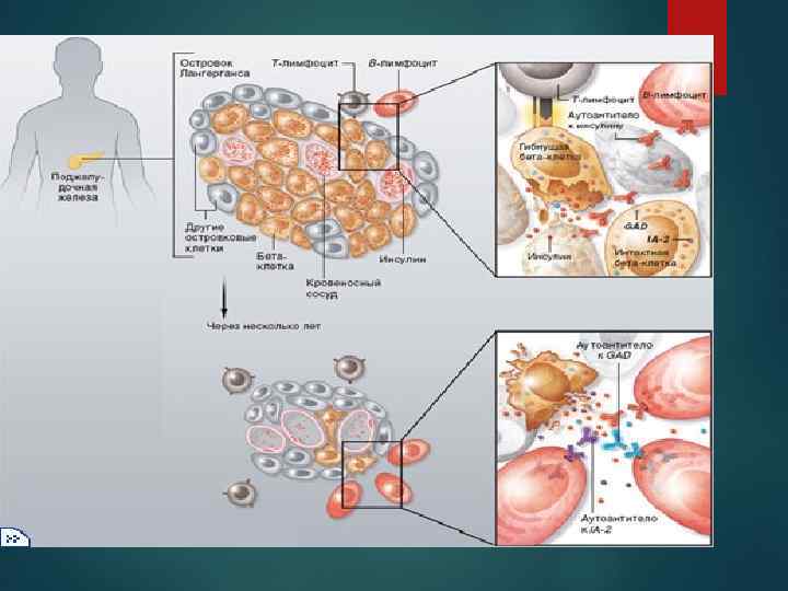 Панкреатическая недостаточность (1 -й тип диабета) Первый тип нарушений характерен для (устаревшее название — инсулинозависимый диабет). Отправным моментом в развитии этого типа диабета является массивное разрушение эндокринных клеток поджелудочной железы (островков Лангерганса) и, как следствие, критическое снижение уровня инсулина в крови. Массовая гибель эндокринных клеток поджелудочной железы может иметь место в случае вирусных инфекций, онкологических заболеваний, панкреатита, токсических поражений поджелудочной железы, стрессовых состояний, различных аутоиммунных заболеваний, при которых клетки иммунной системы вырабатывают антитела против β-клеток поджелудочной железы, разрушая их. Этот тип диабета, в подавляющем большинстве случаев, характерен для детей и лиц молодого возраста (до 40 лет). У человека это заболевание зачастую является генетически детерминированным и обусловленным дефектами ряда генов, расположенных в 6 -й хромосоме. Эти дефекты формируют предрасположенность к аутоиммунной агрессии организма к клеткам поджелудочной железы и отрицательно сказываются на регенерационной способности β-клеток