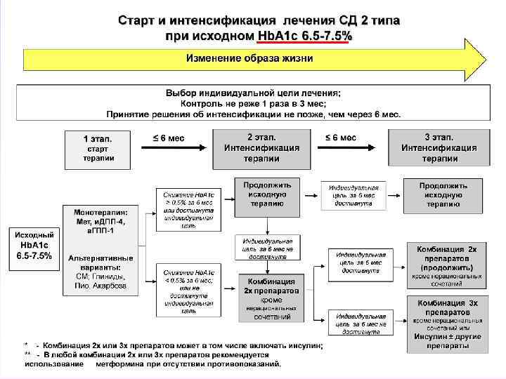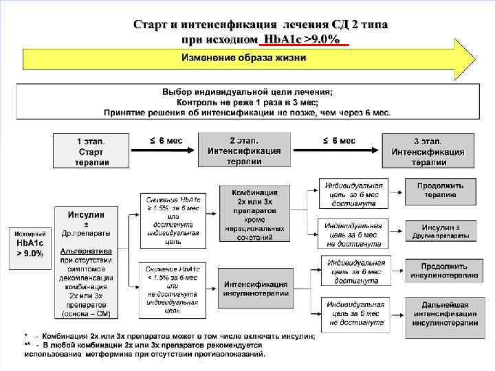 • При исходном Hb. A 1 c 6. 5 -7. 5% возможно использование монотерапии сахароснижающими препаратами. Если достичь поставленных целей не удается, возможно применение комбинированного лечения (два или три препарата). • При исходном Hb. A 1 c 7. 6 -9. 0% - сразу начинать с комбинированной терапии. При неэффективности - сочетание трех сахароснижающих препаратов или инсулинотерапии. • При исходном Hb. A 1 c более 9. 0% при наличии выраженной клинической сиптоматики (потеря массы тела, жажда, полиурия и др. ) - инсулинотерапию (изолированную или в комбинации с пероральными сахароснижающими препаратами).