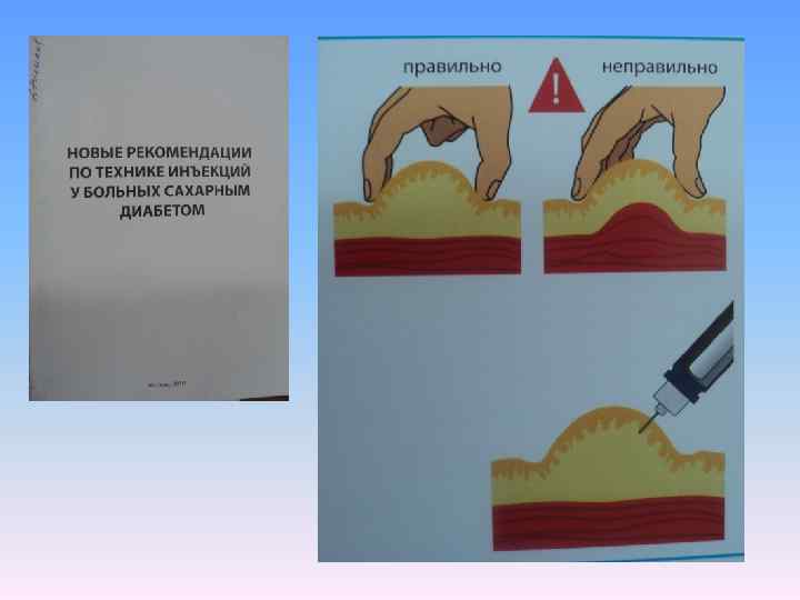 Как вводить инсулин • Короткий инсулин - за 30 мин до приема пищи, В ЖИВОТ • Продленный инсулин – перемешать 20 раз (не взбалтывать!), не зависит от еды. В КОНЕЧНОСТИ • Наберите воздух в шприц • Отступить от предыдущей инъекции на 2 пальца • Сделайте кожную складку большим и указательным пальцем • Введите иглу срезом кверху в основание складки: - под углом 45 град для игл 6 -8 мм - под углом 90 град для игл 4 -6 мм, - введите инсулин, досчитайте до 10 сек. Отпустите кожную складку, вытащите иглу