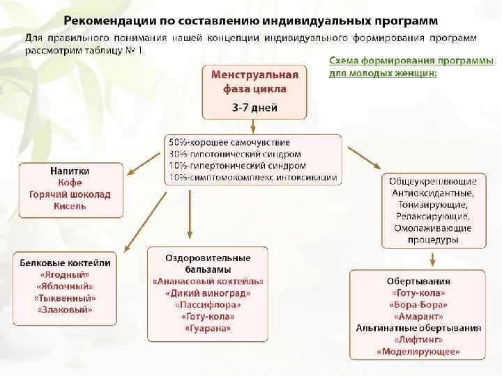 Эффективная стратегия коррекции фигуры на практике основывается на: ● интенсивных косметологические процедурах - ручной массаж - аппаратные процедуры - обертывания ● регулярном домашним уходе ● снижении калорийности рациона до уровня основного обмена (1600 ккал/сутки у женщин) ● использовании жиросжигающих и пр. добавок в питании.