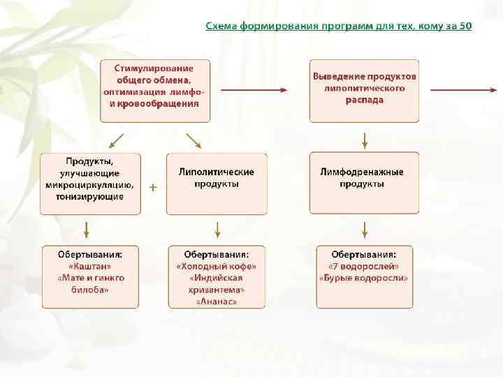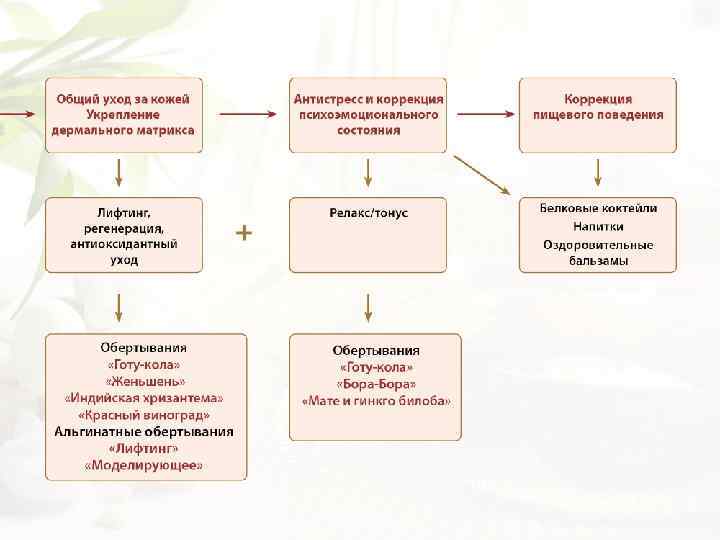 Косметология, функциональное питание и напитки, фитотерапия – это безопасное и постепенное: ●Снижение объемов тела, тонизирование и омоложение кожи ● Обеспечение активации и контроля липидного обмена ● Снижение калорийности рациона, его оптимизация, восполнение дефицитных веществ в пище ● Выработка правильного пищевого поведения ● Восстановление психоэмоционального статуса Комплекс косметологических процедур в сочетании с продуктами функционального питания и фитотерапией – одно из современных решений для коррекции веса, общему оздоровлению и омоложению организма.