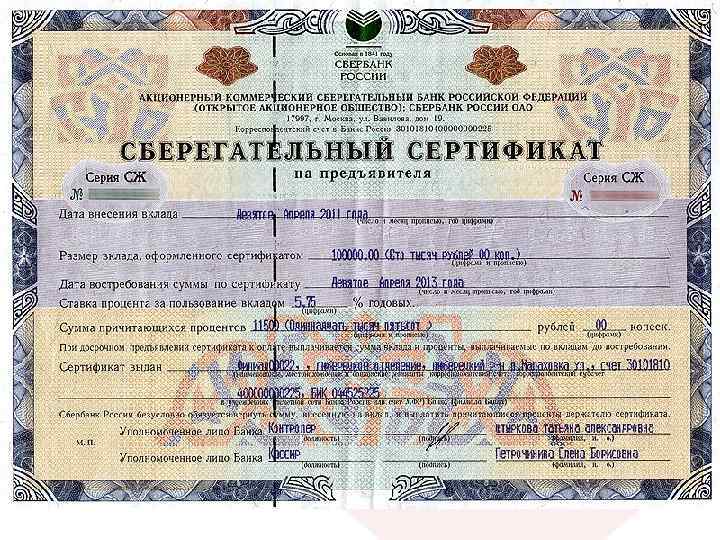 Сберегательный сертификат • аналог депозита, но не пополняемый и без возможности частичного снятия; • суммы начинаются от 10 тыс. руб. ; • сроки составляют, как правило, от 3 месяцев до трех лет; • не участвуют в ССВ, но имеют более высокую процентную ставку.