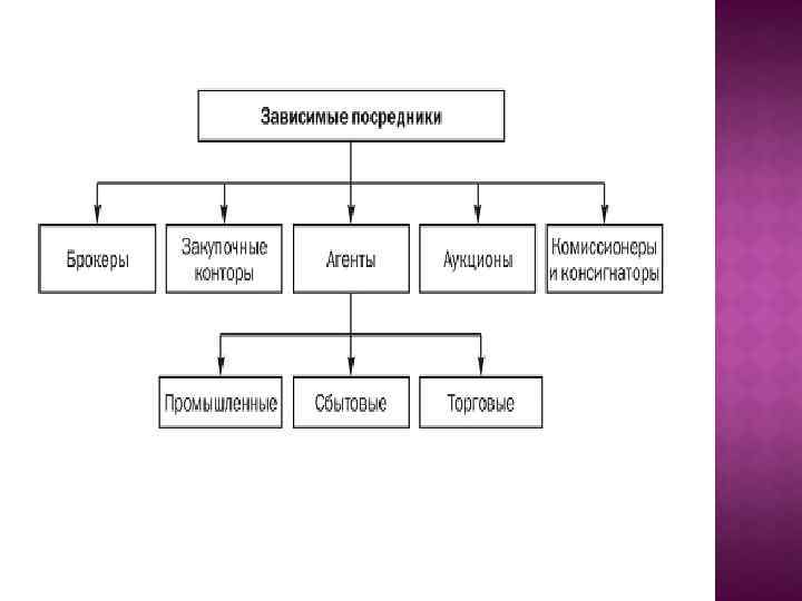 ПРИМЕРЫ НЕЗАВИСИМЫХ ПОСРЕДНИКОВ Дилеры — физическое или юридическое лицо, которые покупают товары у промышленных предприятий и продают их покупателям, принимая на себя сервисные обязанности (мелкий ремонт, поставку запчастей). Доход их образуется за счет разницы в ценах закупки и реализации. Дистрибьюторы (англ. — распределение) — физическое или юридическое лицо, обслуживающие разные отрасли промышленности, имеющие склады и транспортные средства и осуществляющие коммерческую деятельность от своего имени и за свой счет. Чаще всего занимаются сбытом продукции промышленного назначения или реализуют импортируемый товар на территории страны.