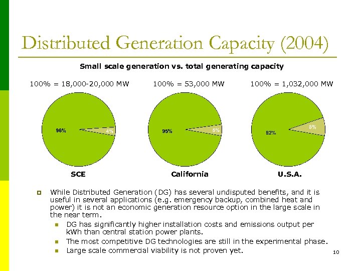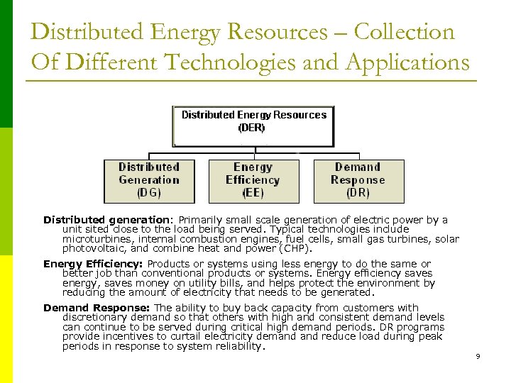 Distributed Energy Resources – Collection Of Different Technologies and Applications Distributed generation: Primarily small scale generation of electric power by a unit sited close to the load being served. Typical technologies include microturbines, internal combustion engines, fuel cells, small gas turbines, solar photovoltaic, and combine heat and power (CHP). Energy Efficiency: Products or systems using less energy to do the same or better job than conventional products or systems. Energy efficiency saves energy, saves money on utility bills, and helps protect the environment by reducing the amount of electricity that needs to be generated. Demand Response: The ability to buy back capacity from customers with discretionary demand so that others with high and consistent demand levels can continue to be served during critical high demand periods. DR programs provide incentives to curtail electricity demand reduce load during peak periods in response to system reliability. 9
