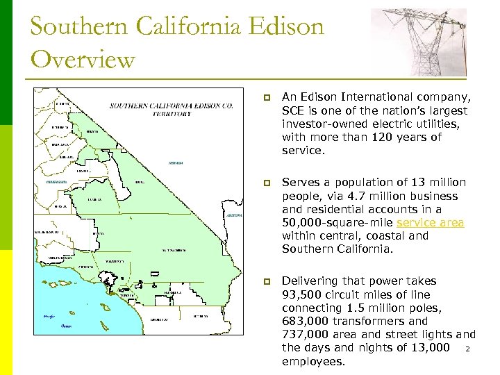 Southern California Edison Overview p An Edison International company, SCE is one of the nation’s largest investor-owned electric utilities, with more than 120 years of service. p Serves a population of 13 million people, via 4. 7 million business and residential accounts in a 50, 000 -square-mile service area within central, coastal and Southern California. p Delivering that power takes 93, 500 circuit miles of line connecting 1. 5 million poles, 683, 000 transformers and 737, 000 area and street lights and the days and nights of 13, 000 2 employees.