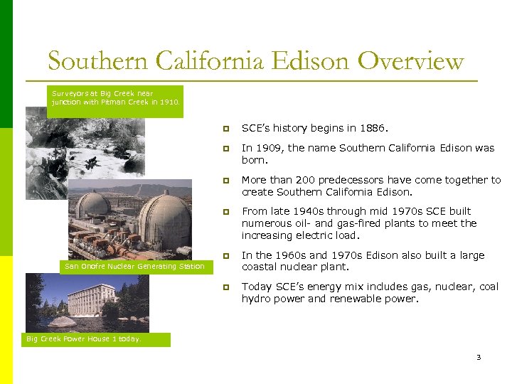 Southern California Edison Overview Surveyors at Big Creek near junction with Pitman Creek in 1910. p SCE’s history begins in 1886. p In 1909, the name Southern California Edison was born. p More than 200 predecessors have come together to create Southern California Edison. p From late 1940 s through mid 1970 s SCE built numerous oil- and gas-fired plants to meet the increasing electric load. p In the 1960 s and 1970 s Edison also built a large coastal nuclear plant. p Today SCE’s energy mix includes gas, nuclear, coal hydro power and renewable power. San Onofre Nuclear Generating Station Big Creek Power House 1 today. 3