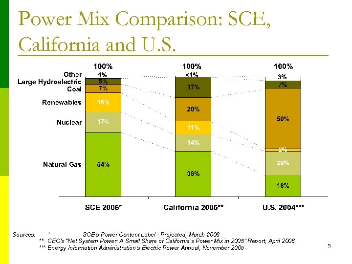 SCE’s Power Procurement Portfolio (2005 Energy Mix) ~2/3 from non-SCE-owned resources NOTE: Percentages based on SCE’s December 2004 forecast, 2003 GRC Request, 2005 ERRA Forecast Proceeding, 2004 DWR Interim Revenue Requirement Decision (D. 04 -01 -028), and Final DWR Power Allocation Decision (D. 04 -12 -014). 4