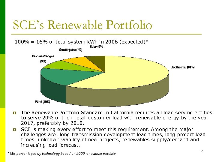 SCE’s Procurement Objectives – Implementation Of The Loading Order System Reliability p p p Price stability Resource adequacy Local area reliability Adequate transmission p p p Cost minimization Financial risk management Optimization of commitments Environmental Considerations p p p Resources with lower greenhouse emission More efficient resources More energy efficiency Balance objectives through CPUC/CEC’s loading order: n Energy Efficiency n Demand Response n Renewable resources n Distributed Generation n Clean and efficient fossil-fired generation. 6