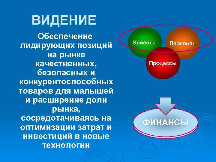 ВИДЕНИЕ Обеспечение лидирующих позиций на рынке качественных, безопасных и конкурентоспособных товаров для малышей и расширение доли рынка, сосредотачиваясь на оптимизации затрат и инвестиций в новые технологии Клиенты Персонал Процессы ФИНАНСЫ