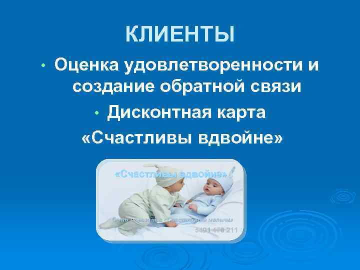 КЛИЕНТЫ • Оценка удовлетворенности и создание обратной связи • Дисконтная карта «Счастливы вдвойне» Сеть магазинов «Счастливый малыш» 5491 476 211